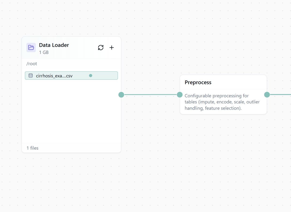 Figure 1: Das Workflow-Canvas mit geladenem Zirrhose-Datensatz.