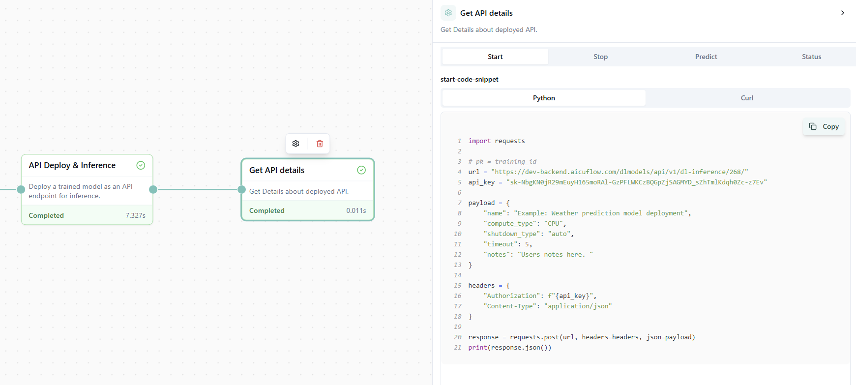 Der Deploy-Node erstellt den Endpoint. Die Details zeigen: