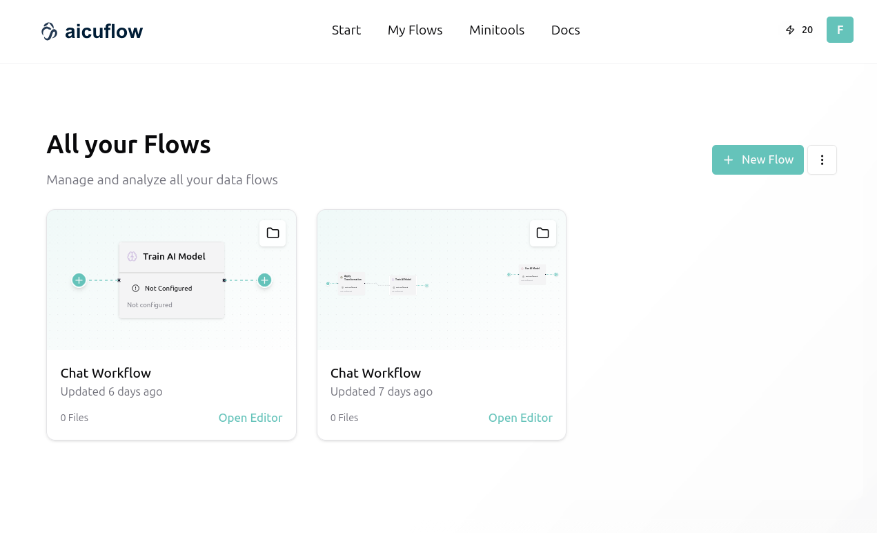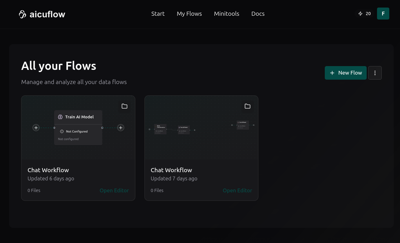 You can use aicuflow to build data pipelines and train AI models. The "Flow" (or pipeline) is the core concept our tool is centered around. You can create and modify flows manually, or by messaging our chatbot. Resulting models and analysis results are saved as files in your specific flow.