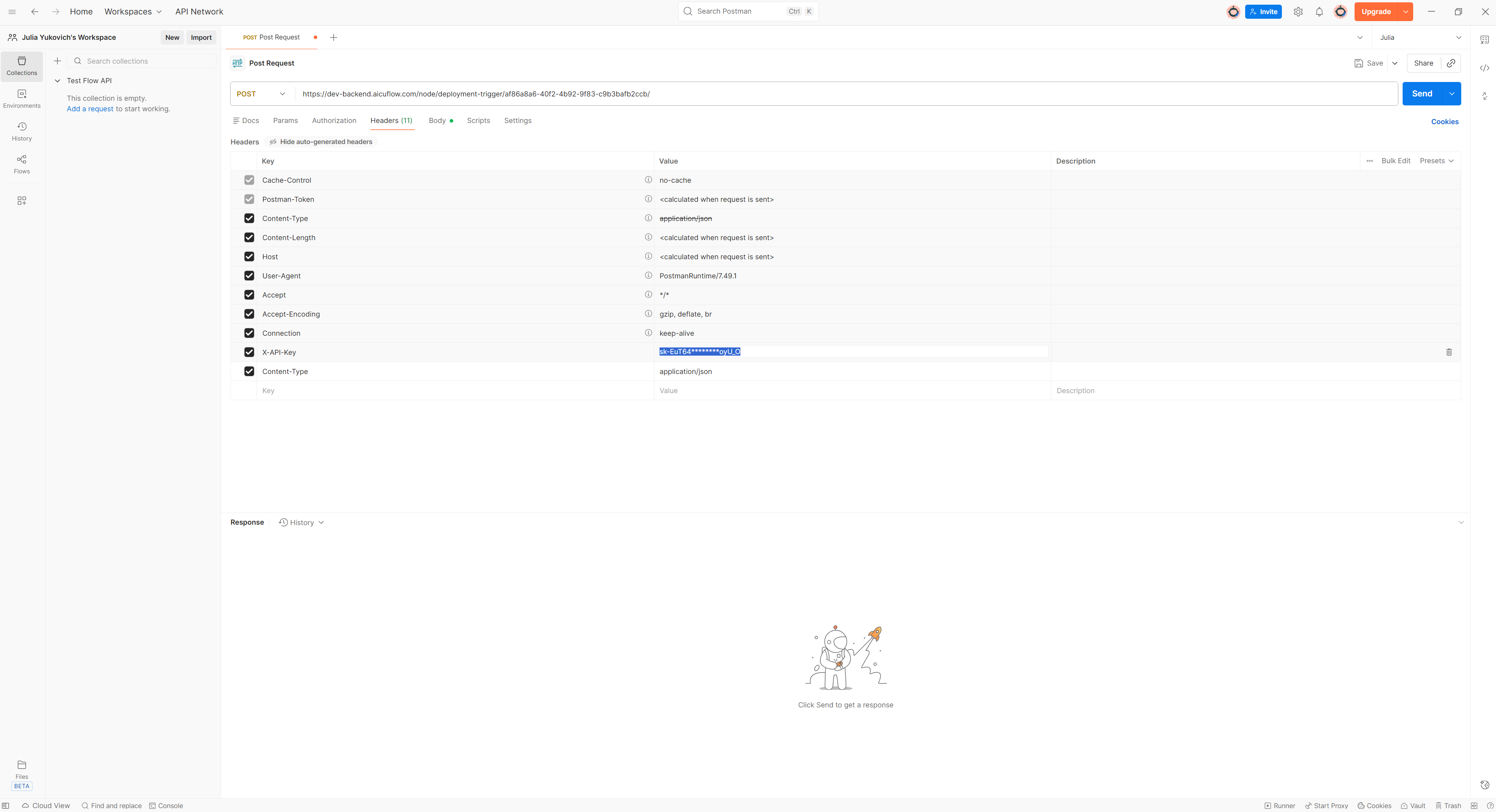 Click on the Headers tab, where you'll find x-API-Key. Paste your full API key that you saved earlier, replacing the masked version (the one with stars).