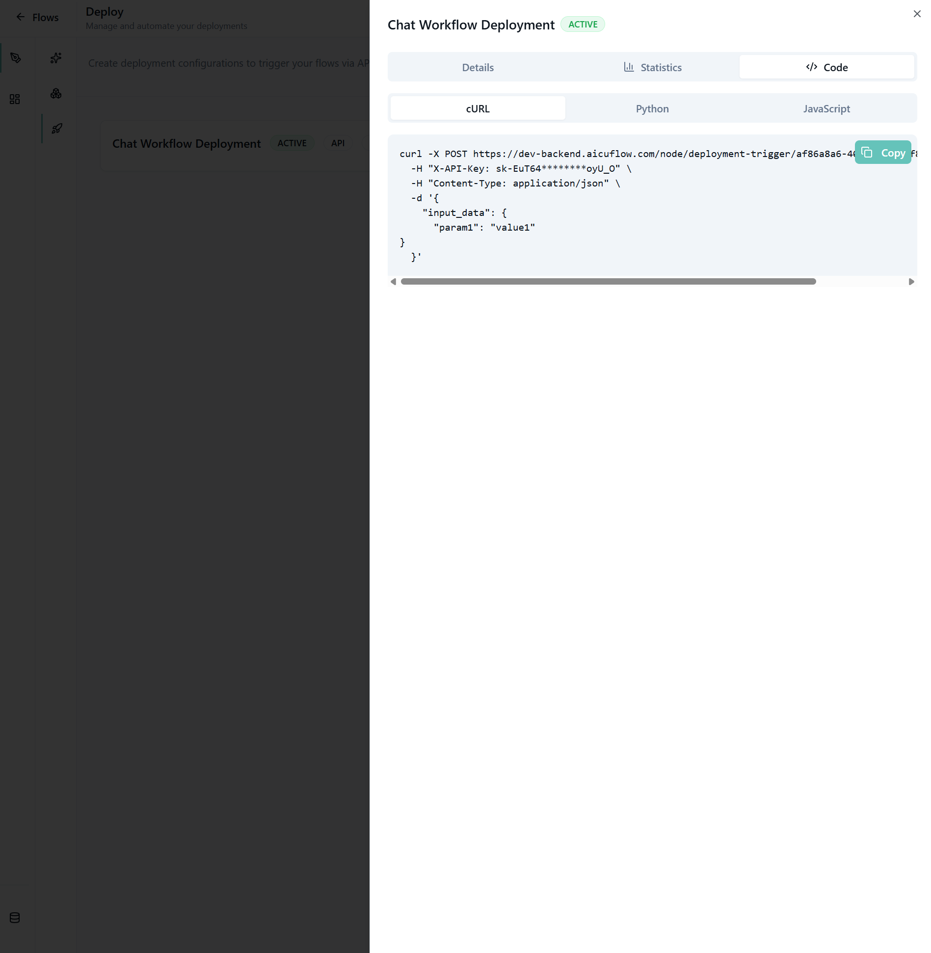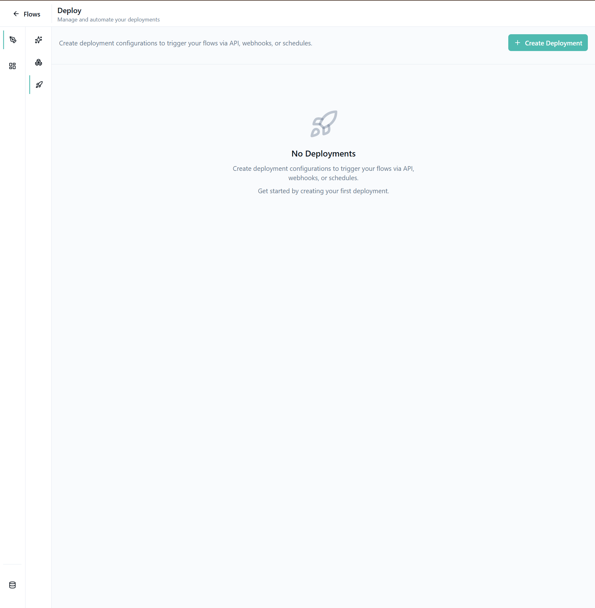 Deploy your flows to make them accessible via API endpoints. Once deployed, you can integrate your flows into your own applications, services, or trigger them from external systems.