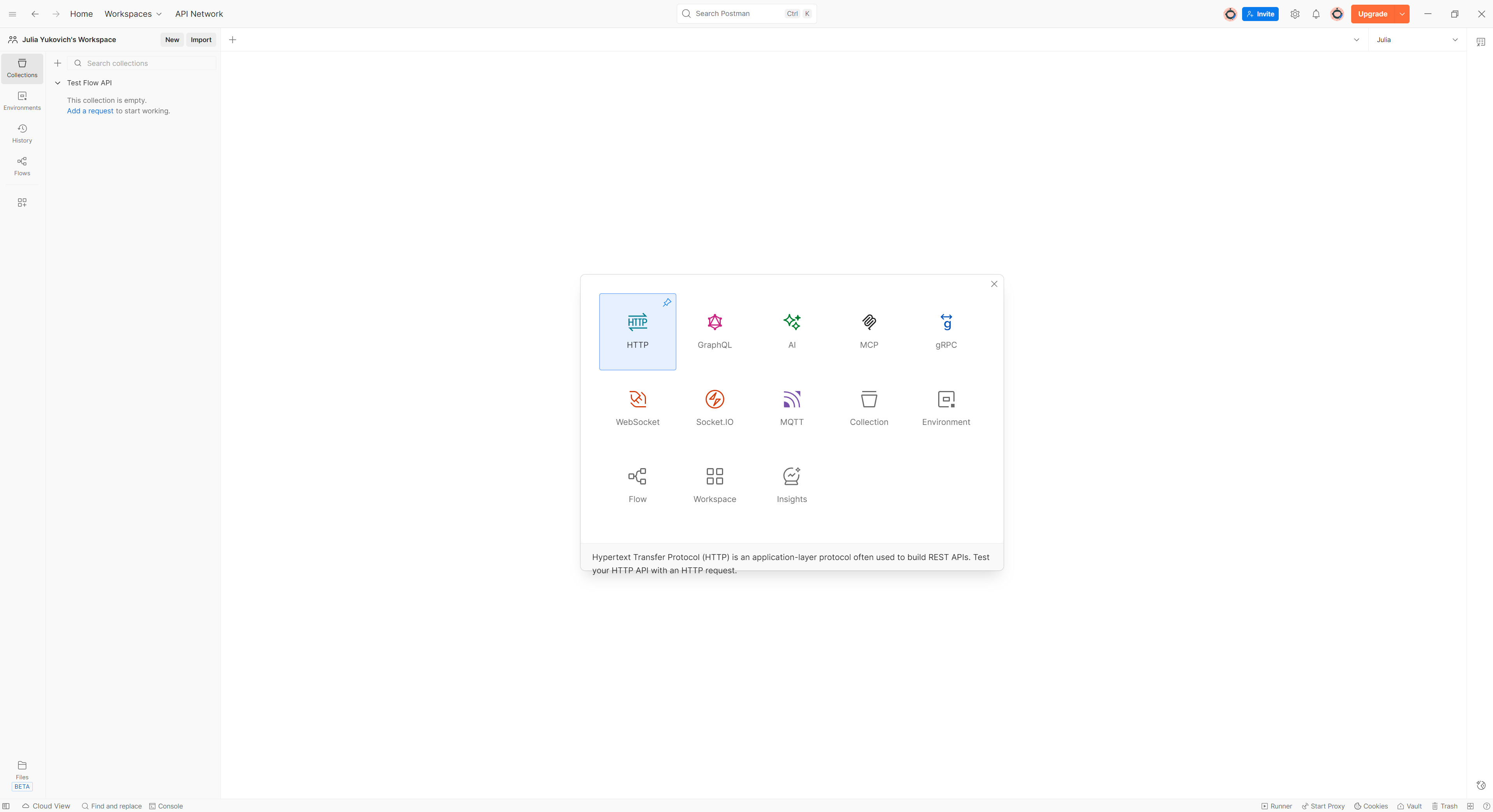 Create a new collection or use an existing one. For example, name it "Test Flow API", then add a new HTTP request by clicking on New.
