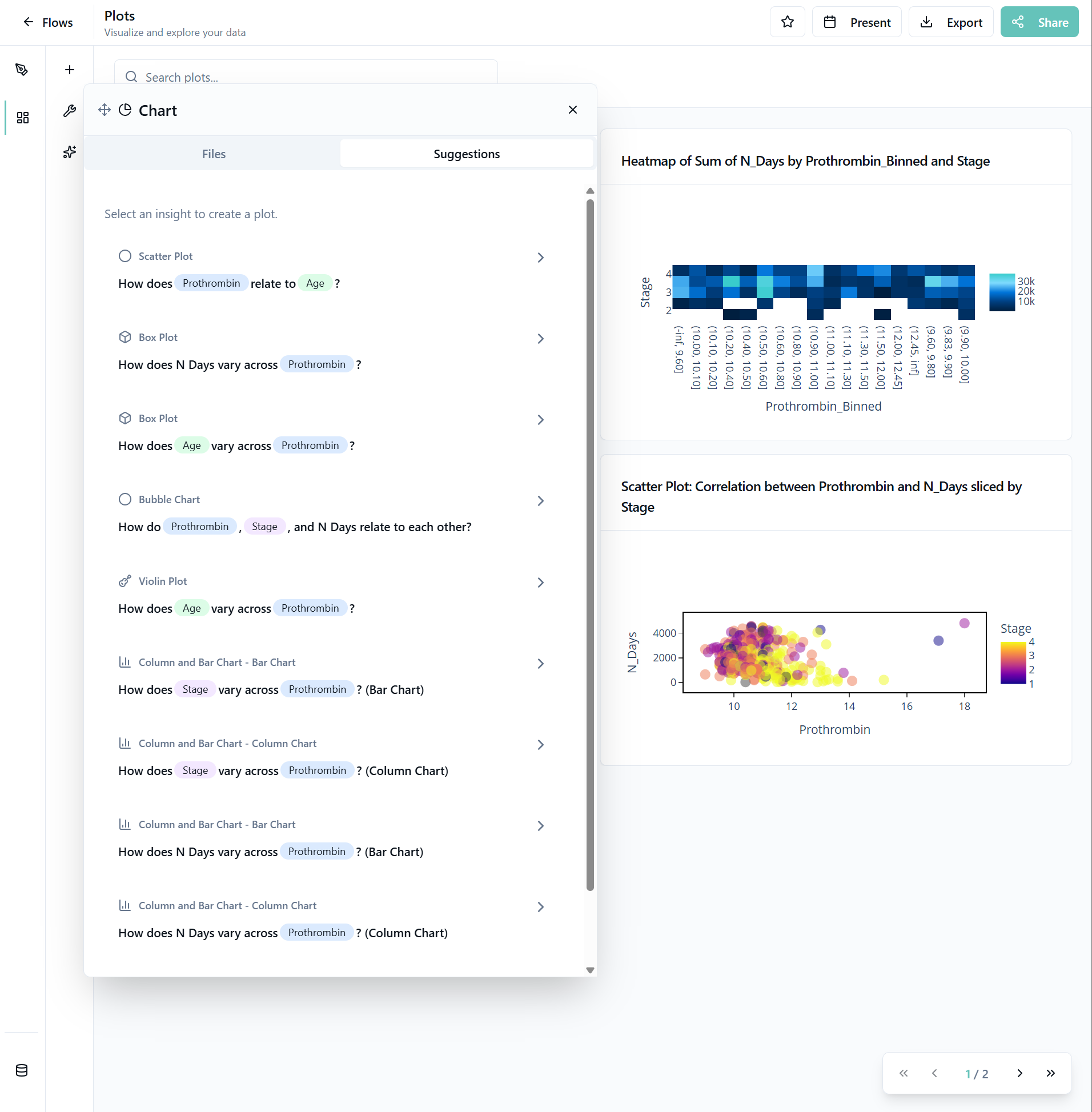Add the plots by clicking on the questions. At the top, you'll see what type of plot you will create. The colored chips indicate what columns you are using for the plots. Same columns across different AI-suggested plots have the same colors.