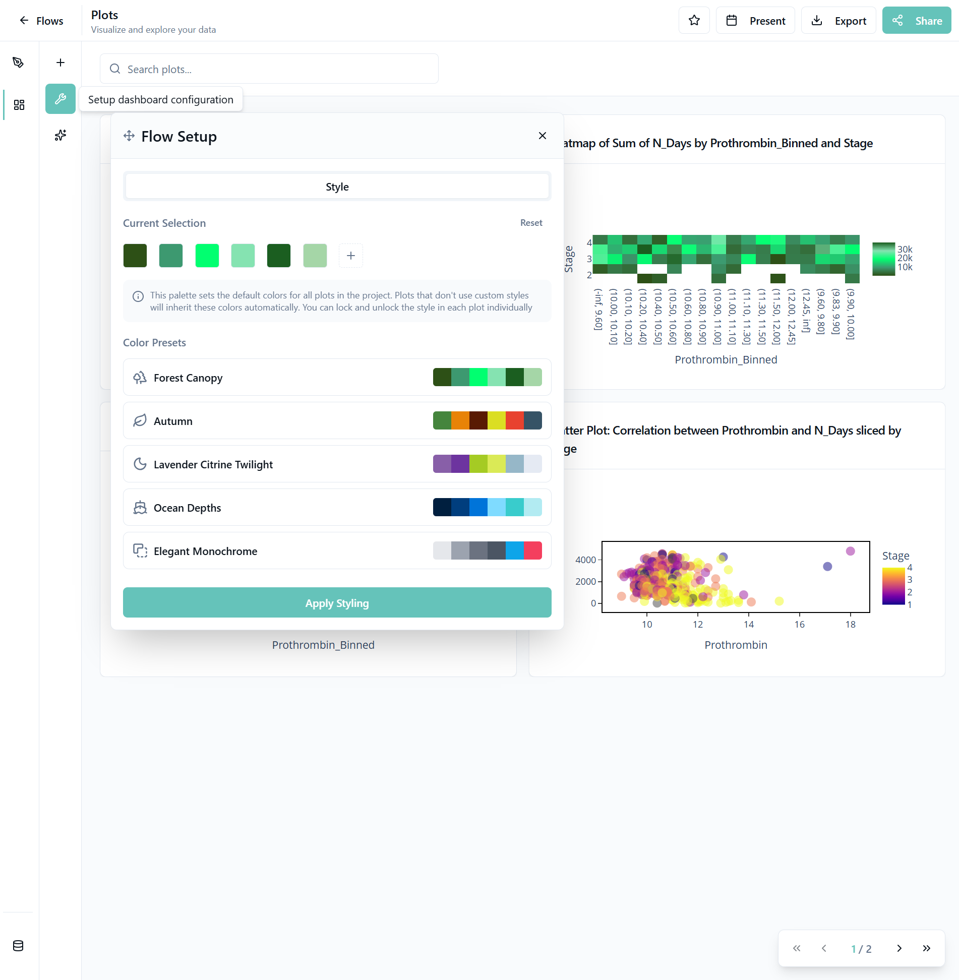 To customize colors and styling for all plots, click on the tool icon. Choose from predefined palettes like Ocean Depths, Forest Copy, and more. Depending on the number of plots, it could take a minute to apply your changes.