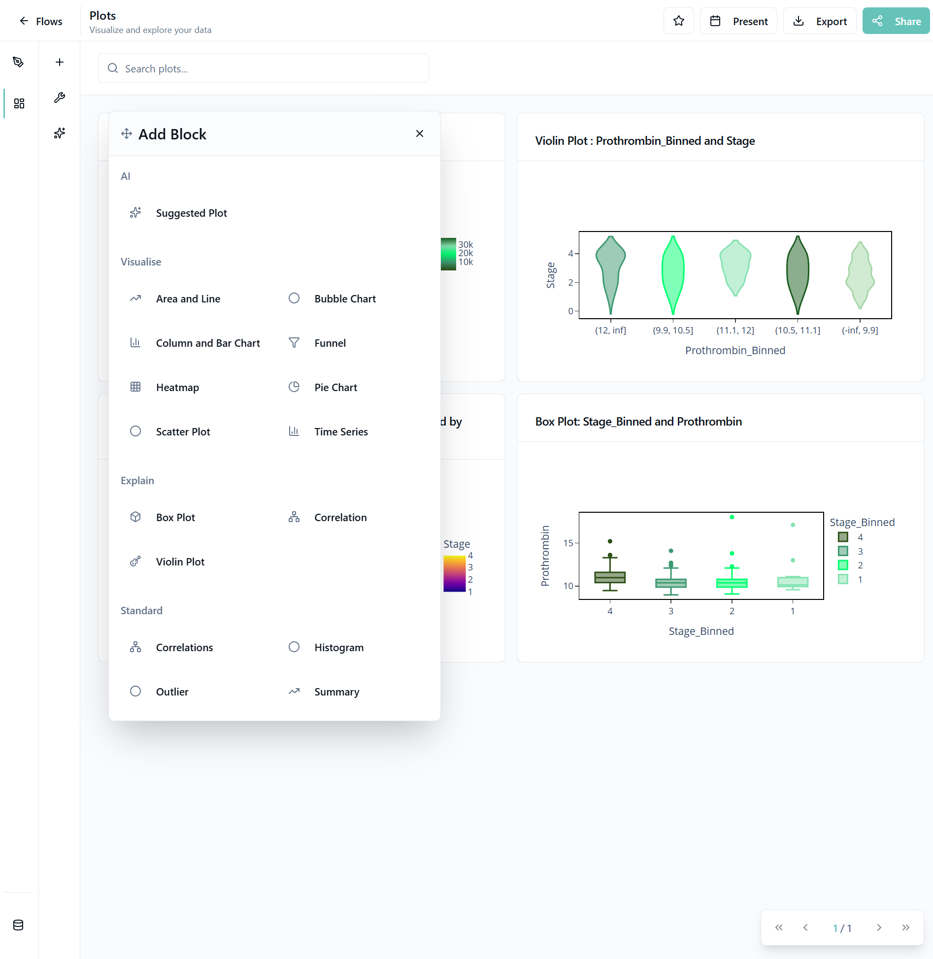 To add relevant plots that you might have missed, click on the plus button and select Suggested Plots at the top of your plot types. You can also start with this step.