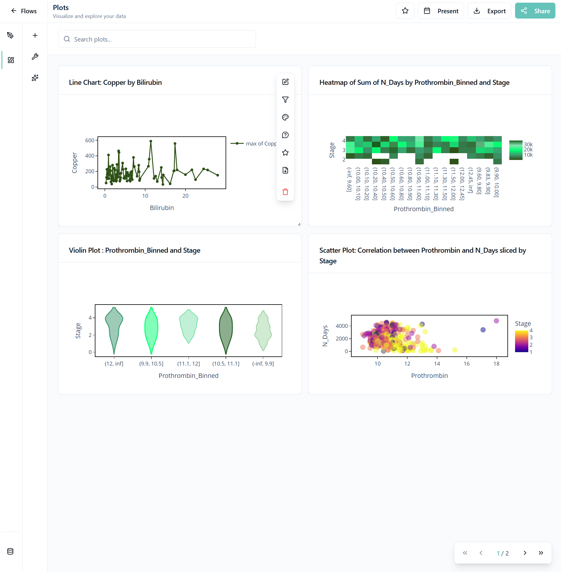 When you're done creating your dashboard, click the present button to view your plots in fullscreen mode. Use the arrows to navigate between plots.
