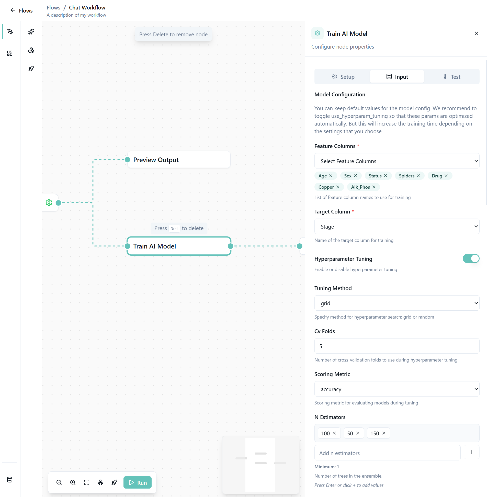 Train custom AI models directly in the Flow Editor using your own data. This guide walks you through the complete process of setting up, configuring, and training an AI model.